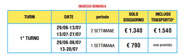 Il 1° giorno arrivo in struttura, sistemazione nelle camere, controllo delle schede sanitarie, cena, presentazione staff e attività.